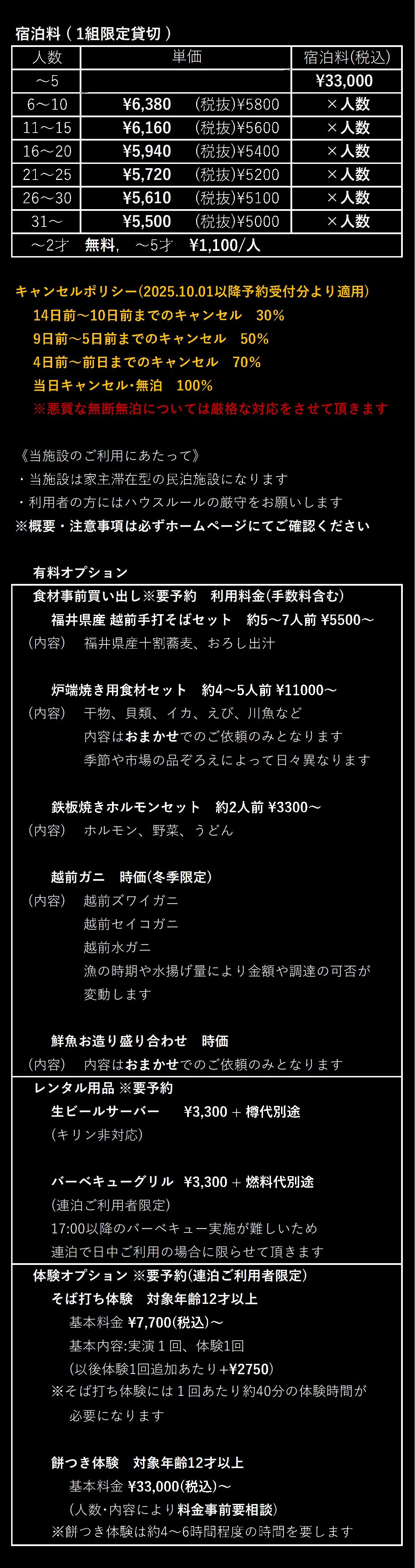 ハウスルール | ・深夜帯(22:00以降)の大音量および屋外での会話の制限 ・就寝時間の厳守(翌1:00) ・過度な飲酒などの無いよう節度あるご利用のお願い ・無断での火気の使用禁止 ・館内全面禁煙 その他近隣の方々への配慮を目的としたモラルの範囲内でのご利用をお願いします |